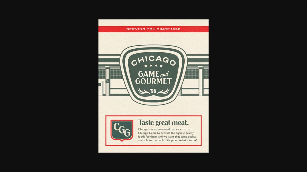 Founded in 1996, Chicago Game & Gourmet is the proud supplier to Chicago's best chefs. With an impressive client list that includes Michelin darlings like Alinea and beloved local shops like Bronzeville Hoagie & Panini Cafe, CGG is widely known to be the source for gourmet meats and kitchen items in Chicago. Despite their reputation, their brand identity was dated, and they came to us in need of an update as they expanded into D2C. We chose to reference the Old Chicago energy to match Peter — CGG's fearless leader — and to emphasize their longevity and experience in the industry. The new branding was received fabulously, and I've stayed with CGG to continue developing their brand and other business endeavors. I also designed & created the CGG website, which you can see here!