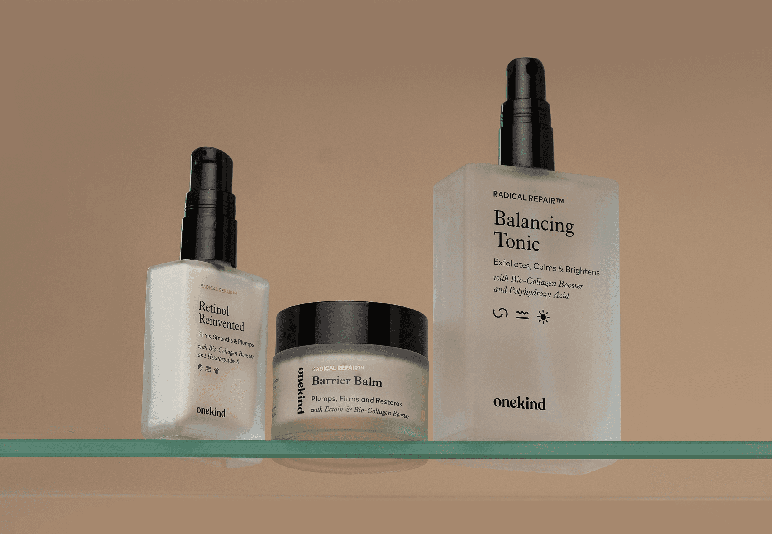Onekind is a natural skin care company promoting organic ingredients and honesty. Their clientele demographic ranges heavily across the board, so we collaborated to make thoughtful product lines and an icon system that transcends age groups and clearly communicates the many benefits of each SKU, including their Radical Repair™ and Drops Collections.